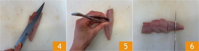 Refine os filés 4 e remova as espinhas com uma pinça de cozinha, ajudando-se com os dedos para localizá-las 5. Por fim, corte os filés limpos em pedaços 6.