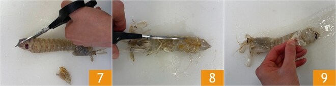 Passe para a Como limpar as tamarutacas: com uma tesoura, corte as extremidades da cauda para formar um triângulo 7, depois faça cortes ao longo dos lados 8 e remova a carapaça 9.