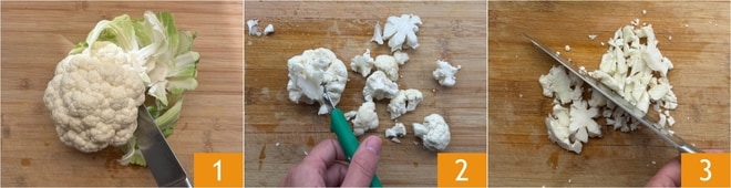 Para preparar o macarrão com couve-flor, primeiro limpe a couve-flor: elimine o talo central e as folhas 1, depois separe os buquês dos talos 2 e reserve-os. Pique grosseiramente os talos com uma faca 3.