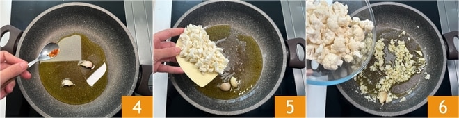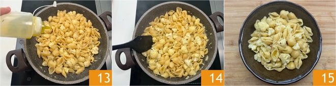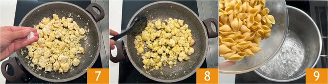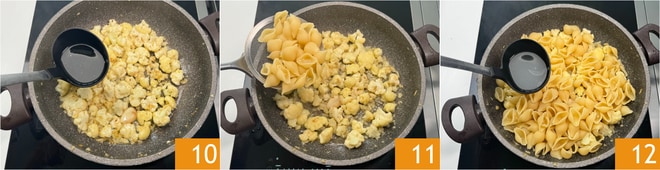 Neste ponto, elimine o alho e regue a couve-flor com uma concha da água de cozimento do macarrão 10, depois abaixe o fogo. Escorra o macarrão bem al dente diretamente na frigideira 11 e termine o cozimento adicionando mais água de cozimento 12.