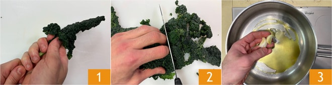 Para preparar a pasta com creme de couve negra, guanciale e pecorino, comece limpando a couve negra: elimine as nervuras centrais 1 e corte as folhas grosseiramente 2. Em uma frigideira, coloque o óleo e adicione os dentes de alho com casca 3.