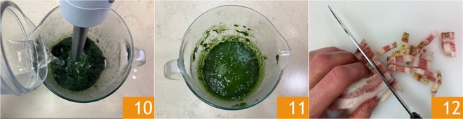 Adicione um pouco de água 10 e bata até obter um creme liso e homogêneo 11. Reserve o creme e corte o guanciale em tiras, após remover a pele 12.