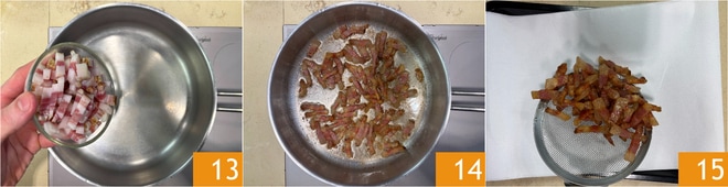 Limpe a frigideira onde você cozinhou a couve negra e aqueça bem, depois adicione o guanciale 13. Cozinhe em fogo médio por 5-7 minutos, até que o guanciale fique crocante 14. Transfira-o para um papel toalha 15.