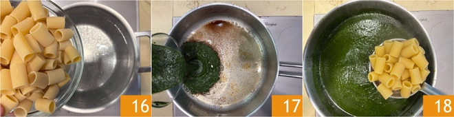 Enquanto isso, cozinhe o macarrão em bastante água fervente com sal 16. Coloque o creme de couve negra na mesma frigideira onde você cozinhou o guanciale 17. Escorra o macarrão al dente e transfira-o para a frigideira 18.