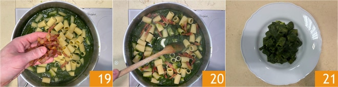 Adicione uma parte do guanciale 19 e misture para incorporar os ingredientes 20. Se a pasta estiver muito seca, você pode adicionar um pouco da água de cozimento. Sirva no prato 21.