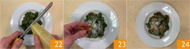 Complete com uma pitada de pecorino ralado 22 e com o restante do guanciale crocante 23. A pasta com creme de couve negra, guanciale e pecorino está pronta para ser servida 24!