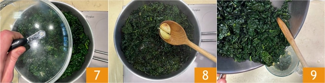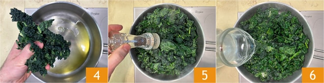 Adicione a couve negra 4 e ajuste o sal e a pimenta 5. Cozinhe por 5-7 minutos, mexendo de vez em quando, até que a couve esteja murcha. Nesse ponto, adicione um pouco de água 6.