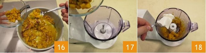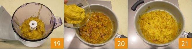 Acione as lâminas até obter uma mistura cremosa 19 que você transferirá novamente para a frigideira com o tempero 20 para dar-lhe a cremosidade certa 21.