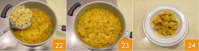 Escorra agora a massa al dente diretamente na frigideira 22 e misture bem para que a massa absorva o tempero 23. Agora a massa com abóbora está pronta para ser servida e saboreada 24!
