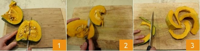 Para preparar a massa com abóbora, primeiro pegue a abóbora: corte-a primeiro em grandes partes 1, retire as sementes e os filamentos internos 2, depois corte em fatias e retire a casca 3.