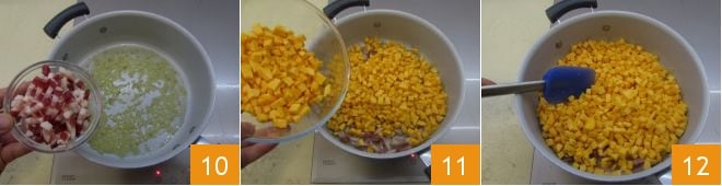Quando a cebola estiver murcha, adicione o bacon 10 e deixe dourar por alguns minutos junto com os ramos de alecrim. Deixe o ramo inteiro e, após deixar temperar, retire-o. Em seguida, adicione também a abóbora na frigideira 11 e mexa tudo 12.