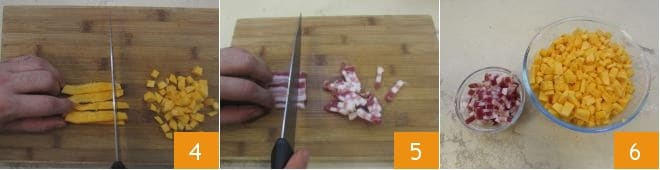Corte as fatias primeiro em tiras e depois em cubos de cerca de 1 cm 4, depois pegue o bacon e corte-o em pequenas tiras 5, então coloque a abóbora e o bacon em duas tigelas 6.