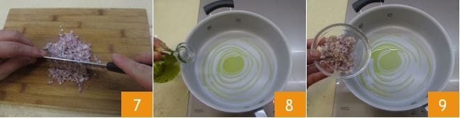 Enquanto isso, coloque uma panela com água salgada para ferver; pique a cebola 7, depois pegue uma frigideira, acrescente o óleo 8, aqueça e junte a cebola picada 9. Misture e deixe cozinhar suavemente, mexendo de vez em quando para não queimar.