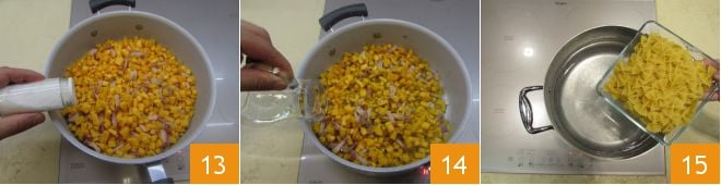Tempere com pimenta e sal 13 e cubra com o Caldo de legumes (ou água quente) cozinhando por 15-20 minutos 14. Quando a água ferver, coloque a massa para cozinhar 15.