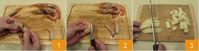 Para preparar a massa com almôndegas de peixe, comece limpando os camarões (para mais detalhes sobre a limpeza, você pode consultar nossa escola de culinária: como limpar camarões) e enxágue-os sob água corrente abundante. Separe agora a cabeça da cauda, segurando-a entre os dedos e puxando delicadamente 1. Retire também as patinhas, depois elimine a carapaça e a cauda. Uma vez feita essa operação, com uma faquinha, faça um corte nas costas do camarão e remova o intestino, tomando cuidado para não quebrá-lo 2: reserve os camarões. Proceda removendo a casca do pão e cortando o miolo em cubinhos 3.