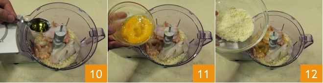 Depois adicione o óleo 10, o ovo batido 11 e o queijo Grana Padano DOP ralado 12. Por fim, ajuste o sal e a pimenta.