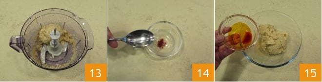 Bata os ingredientes até obter uma mistura homogênea 13. Pare as lâminas do mixer e transfira para uma tigela grande. Depois, dissolva o açafrão em uma tigelinha com um pouco de água quente (aquela pronta para cozinhar a massa será ótima) 14: adicione à mistura obtida 15.