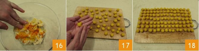 Misture bem os ingredientes, mexendo energicamente com as mãos 16. Quando estiverem bem misturados, pegue cerca de 6 g de massa e crie as almôndegas 17: ao todo, você obterá 105 que poderá dispor em uma bandeja 18.