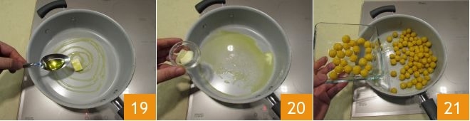 Neste ponto, pegue uma frigideira antiaderente de fundo largo e coloque óleo e manteiga 19: quando a manteiga estiver derretida e o óleo quente, doure um dente de alho 20. Uma vez dourado, retire-o. Agora coloque as almôndegas 21: doure-as por 4-5 minutos em fogo alto, cuidando para não grudarem no fundo da frigideira.