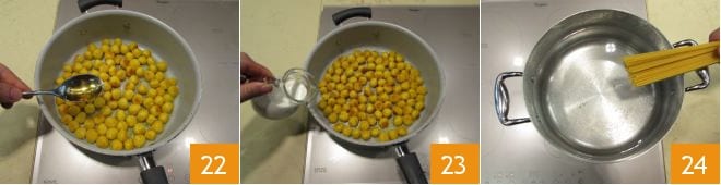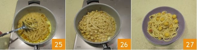 quando estiverem al dente, escorra-os diretamente na frigideira com o molho de almôndegas 25: misture bem a massa com o molho 26, levará apenas alguns instantes. Então, desligue o fogo e sirva sua massa com almôndegas de peixe para saborear bem quente 27!