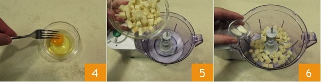 Coloque a água quente para ferver em uma panela grande e, quando estiver fervendo, adicione sal a gosto: isso será para cozinhar a massa. Em seguida, bata o ovo em uma tigelinha 4 e pegue um mixer no qual você colocará o miolo de pão 5 e o alho descascado, tendo removido também o miolo interno 6.