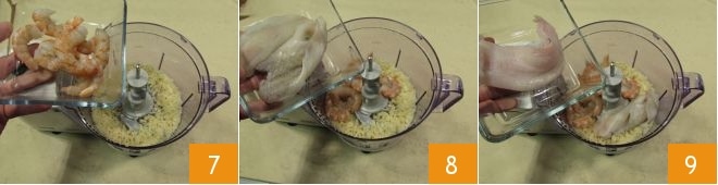 Adicione no mixer também as caudas dos camarões limpas 7, o filé de bacalhau 8 e o linguado 9. Você pode picar os peixes grosseiramente ou colocá-los inteiros: ao processá-los no mixer, as carnes macias serão trituradas igualmente.