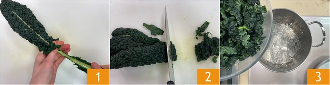 Para preparar a massa com linguiça e couve, primeiro lave a couve e retire o caule central 1, depois corte-a em pedaços 2. Cozinhe em água fervente salgada por 5 minutos 3.