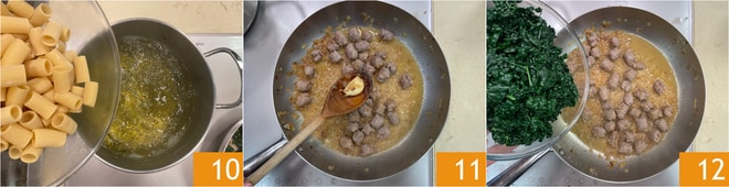 Enquanto isso, cozinhe a massa na água de cozimento da couve que você reservou e levou novamente para ferver 10. Retire o alho da frigideira 11 e adicione a couve 12, depois tempere com sal e pimenta.