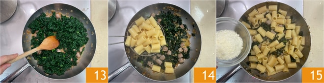 Misture para amalgamar os ingredientes 13 e apague o fogo. Escorra a massa al dente e transfira para a frigideira 14, depois misture adicionando uma concha da água de cozimento e o queijo parmesão ralado 15.