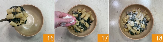 Sirva no prato 16, depois complete com mais queijo parmesão ralado a gosto 17 e uma pitada de pimenta. A massa com linguiça e couve está pronta para ser saboreada 18!