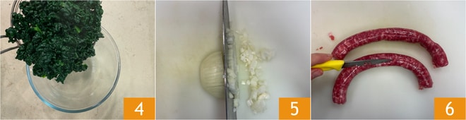 Escorra 4 e reserve tanto a couve quanto a água do cozimento. Descasque e pique finamente a cebola 5, depois retire a pele da linguiça 6 e corte-a em pedaços.