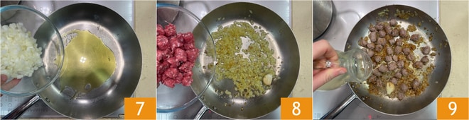 Em uma frigideira, aqueça o óleo, adicione a cebola 7 e o alho com casca, depois deixe refogar suavemente por 2 minutos. Adicione a linguiça 8 e doure em fogo médio-alto até que fique dourada. Agora adicione o vinho branco 9 e deglace a frigideira mexendo e deixando evaporar todo o álcool.