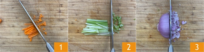 Para preparar a pasta e feijão com couve preta, comece com os vegetais do refogado: descasque e pique a cenoura 1, o aipo 2 e a cebola 3.