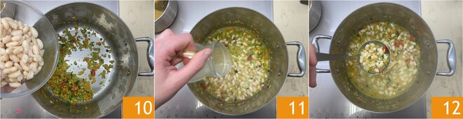 Adicione os feijões cannellini 10 e regue com o vinho 11. Em seguida, adicione uma concha de caldo e a crosta do Parmigiano, deixe ferver por 10 minutos. Retire a crosta que terá liberado seu sabor. Retire duas conchas de sopa 12.