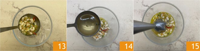 Despeje as conchas de sopa em uma tigela 13 com uma concha de caldo 14, bata com o mixer de imersão 15.