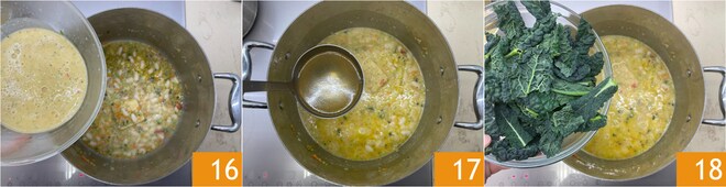 Despeje na panela o purê obtido 16, mais caldo 17 e as folhas de couve 18.