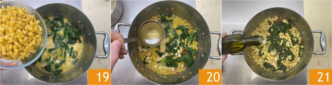 Agora adicione também a massa 19 e cozinhe adicionando o caldo 20 conforme necessário 20. Por fim, misture com um fio de óleo 21.