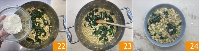Parmigiano Reggiano DOP ralado 22 e pimenta a gosto. Misture 23 e sirva a pasta e feijão com couve preta bem quente 24.