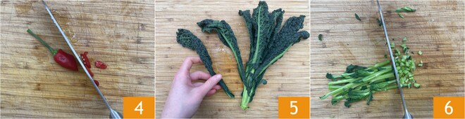 Pique também a ponta de uma pimenta 4 e limpe a couve preta, retire as folhas 5 e pique os talos 6.