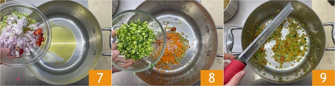 Prepare o clássico refogado com óleo, os vegetais picados, a pimenta 7 e os talos da couve preta 7. Doure e adicione o alecrim picado e o alho ralado 9.