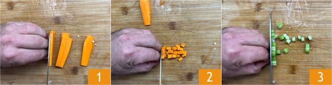 Para preparar o macarrão e feijão enlatado, a primeira coisa a fazer é cuidar dos legumes. Corte as cenouras primeiro em fatias 1 e depois em cubinhos de 1 cm 2. Faça o mesmo com o aipo 3.