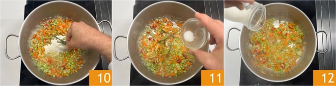 Adicione o alecrim 10, ajuste o sal 11 e deixe cozinhar em fogo médio por 5 minutos. Enquanto isso, coloque no fogo uma panela cheia de água. Regue com vinho branco 12 e deixe evaporar toda a parte alcoólica.