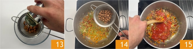 Enquanto isso, abra a embalagem de feijão e escorra-os 13, enxágue-os para eliminar totalmente a água de conserva. Coloque o feijão na panela 14 e cozinhe por mais 5 minutos mexendo bem. Retire o alho e o alecrim, então despeje na panela o purê de tomate 15.