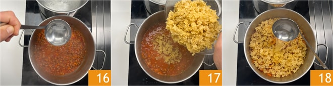 Cozinhe por 20 minutos adicionando água quente 16 para não deixar engrossar muito. Adicione o macarrão cru 17 e acrescente água quente 18 até cobrir completamente. Cozinhe o macarrão adicionando água quente quando necessário e mexendo de vez em quando.