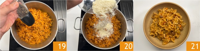 Quando estiver cozido, ajuste o sal e desligue o fogo. Adicione uma pitada de pimenta 19, o queijo pecorino romano 20 e misture bem. Seu macarrão e feijão enlatado está pronto para ser saboreado 21.