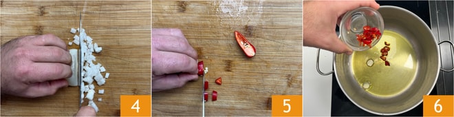 Corte a cebola em cubinhos de 0,5 cm 4. Pique finamente a pimenta 5. Em uma panela, aqueça o óleo e adicione o alho cortado ao meio e a pimenta 6. Deixe dourar por 1 minuto em fogo médio.