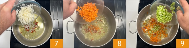 Adicione a cebola 7, as cenouras 8 e o aipo 9.