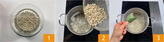 Para preparar a pasta e feijão à napolitana, a primeira coisa a fazer é deixar os feijões de molho por 8-12 horas 1. Em seguida, escorra-os, lave-os e coloque-os em uma panela grande com água fria, até cobri-los 2. Adicione a folha de louro 3 e cozinhe por 2-3 horas. Os tempos são indicativos, recomendamos não salgar os feijões e verificar o cozimento de tempos em tempos.
