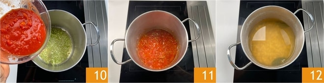 Quando o refogado estiver bem dourado, mas não queimado, retire o alho e adicione os tomates pelados 10. Deixe cozinhar por cerca de dez minutos. Neste ponto, os feijões estarão cozidos 12.
