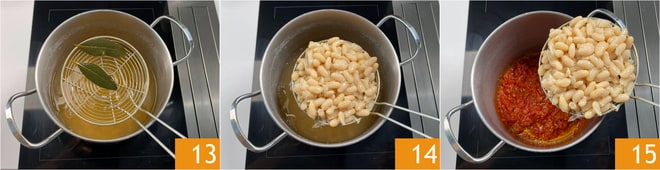 Retire a folha de louro 13, retire os feijões com uma escumadeira 14 e coloque-os no molho 15.